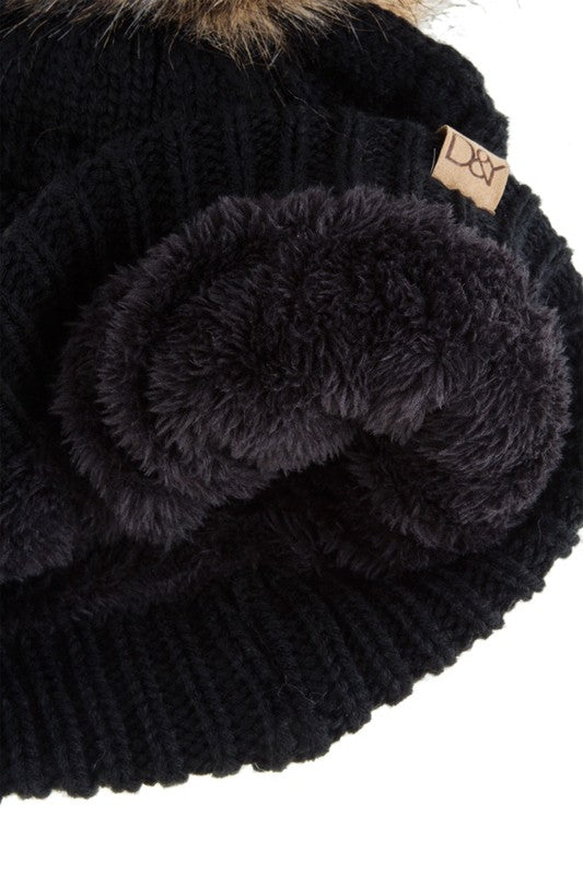 Cable Knit Beanie with Super Pom and Inner Lining