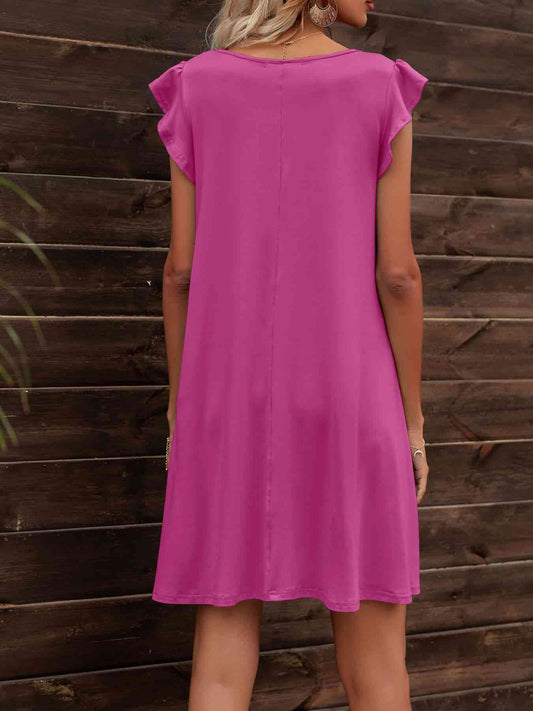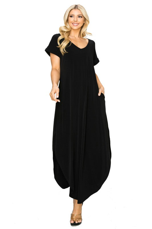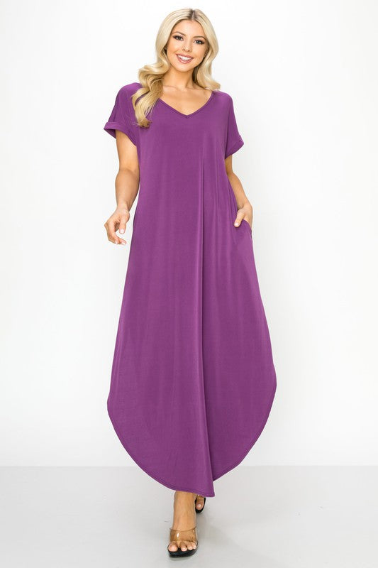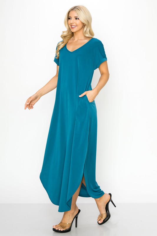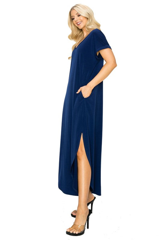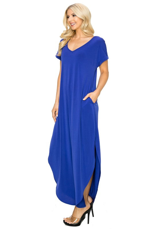V-Neck Short Sleeved Slit Pocket Maxi Dress