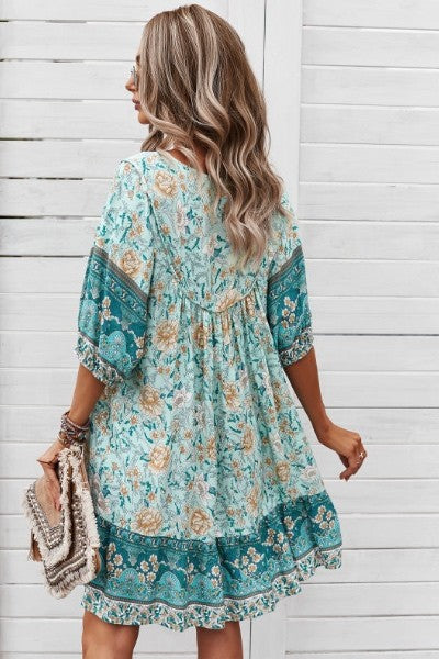 Floral Boho Shirred Bubble Viscose Notch Blouse