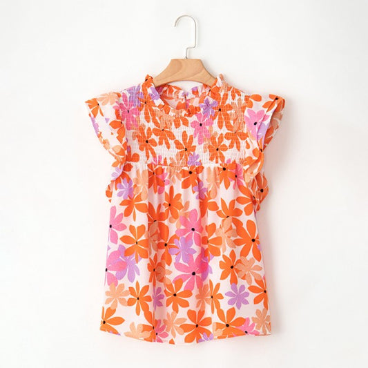 Orange Ruffled Sleeve Smocked Floral Top Blouse