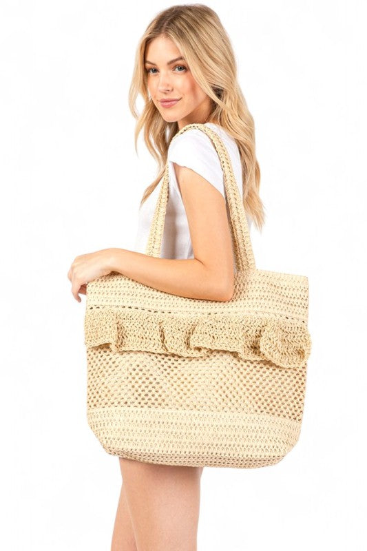 Ruffle Crochet Straw Tote Bag